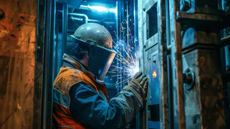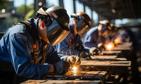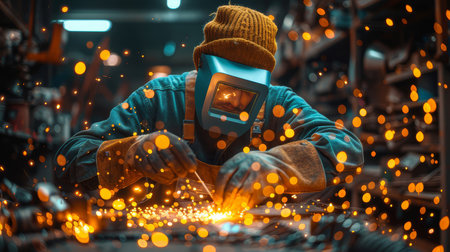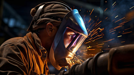 Skilled worker welding in manufacturing facility with sparks flying and protective gear in use. Generative AI