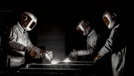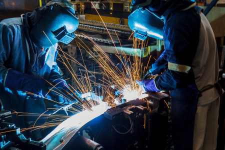 Two skilled welders work together to join metal, creating bright sparks in an industrial setting. The dim surroundings highlight their protective gear and the intense light from the welding process.