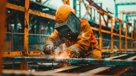 A welder in protective gear works on a construction site, sparks flying as they weld metal beams.