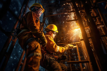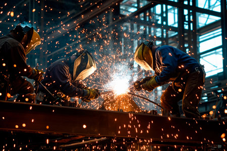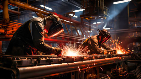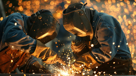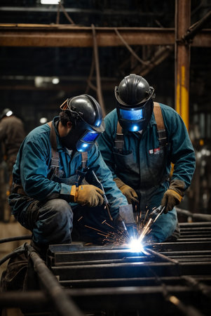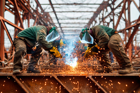 Two skilled workers engage in a welding task, their protective gear glowing against a backdrop of steel beams. Sparks fly as they reshape metal, showcasing craftsmanship and teamwork.