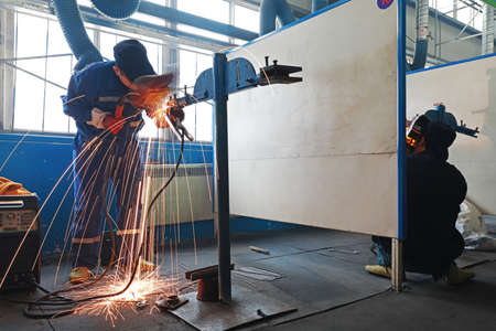 Professional welder wearing protective mask performs work at steel structure manufacturing plant. Yellow sparks spill around