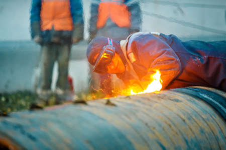 Protective masks and leather gloves are a must as these welders work in tandem creating a shower of sparks as they weld pipes together