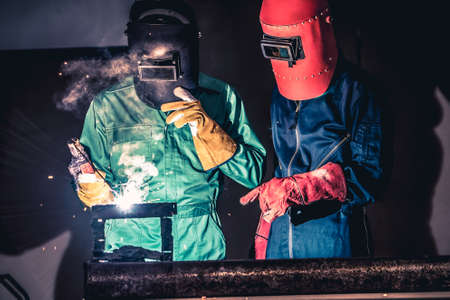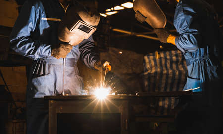Factory technicians are welding young. Metal welding steel works using electric arc welding machine to weld steel at factory.