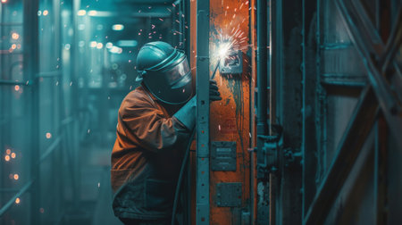 An industrial worker in protective gear skillfully welds metal, creating bright sparks against a vibrant backdrop. The scene captures determination and craftsmanship.