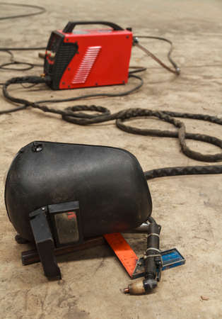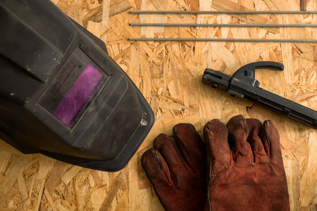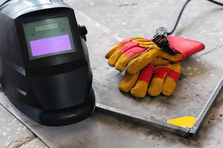 Welding helmet, gloves and metal frame on the floor background.