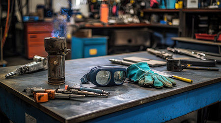 A detailed view of an industrial workshop table featuring essential tools and safety gear. Steam rises from equipment, highlighting the workspace atmosphere.