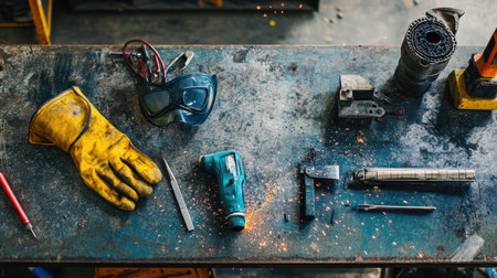 A detailed workspace featuring various tools and safety equipment on a workbench. Gloves and goggles add protection amid sparks, showcasing craftsmanship.