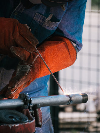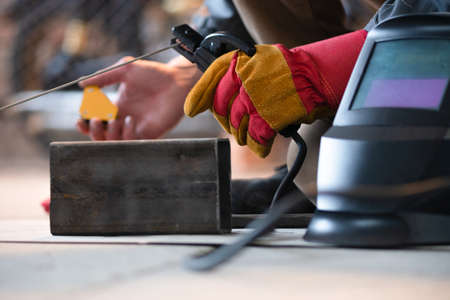 Welder is welding a metal pipe on the workbench.