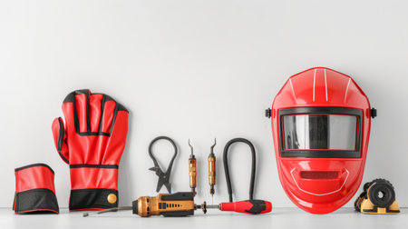 Welding equipment with mask and red gloves on white backdrop.