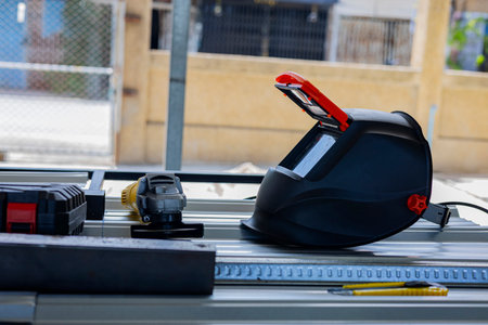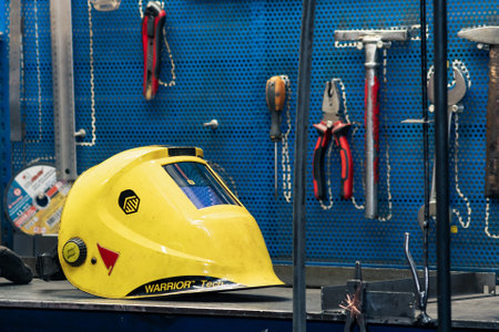 Perm, Russia - September 21, 2022: welding mask lies on a workbench with tools