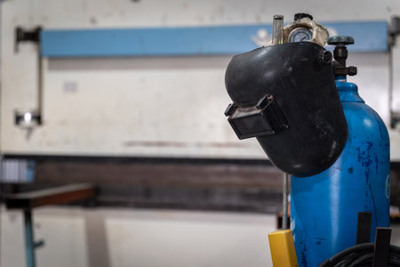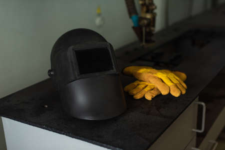 Welding mask and gloves on table in factory