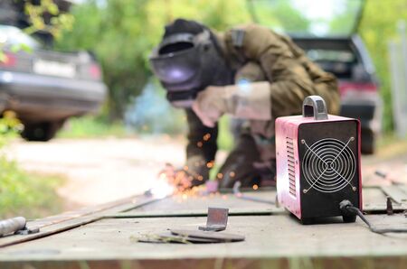 Old man welder in brown uniform, welding mask and welders leathers, weld metal door with arc welding machine outdoors, blue sparks fly to the sides