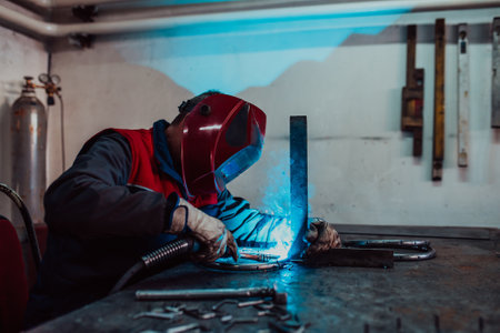 Welder performs welding work on metal in protective mask.