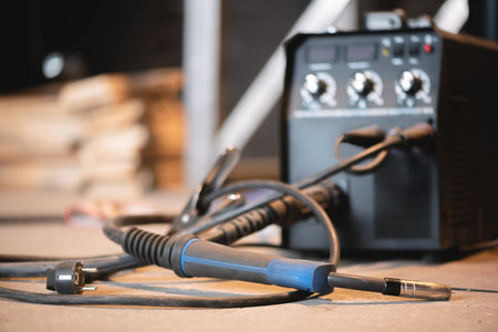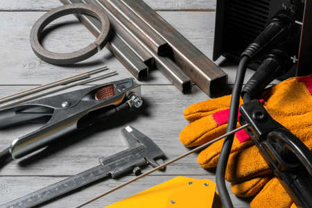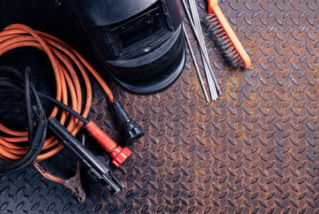 Welding machine, mask, gloves and other equipment on the flat lay workbench background.
