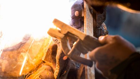 A piece of metal is being welded, and the sparks are flying. Concept of danger and excitement, as the sparks and smoke create a dramatic and intense atmosphere. The process of welding requires skill