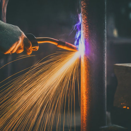 A worker is engaged in welding, producing bright sparks and flames in a workshop. The glowing metal and smoke create a dynamic atmosphere, highlighting craftsmanship and precision.