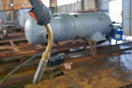 A gun for manual semi-automatic welding against the background of a tank for an oil refinery.
