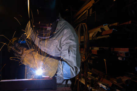 Welder uses welding machine to make sparks during manufacture of metal construction.