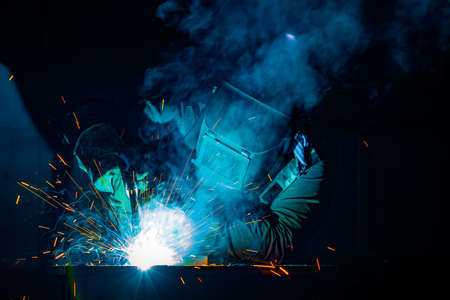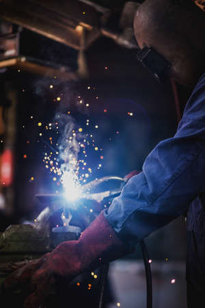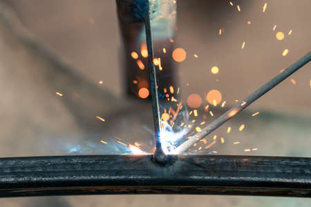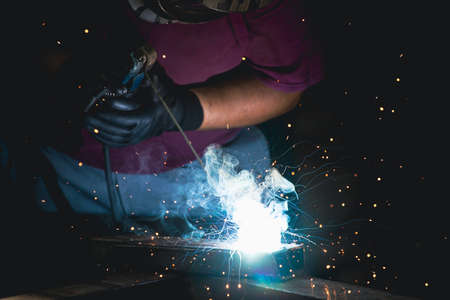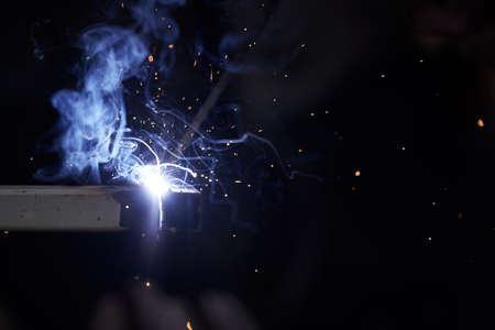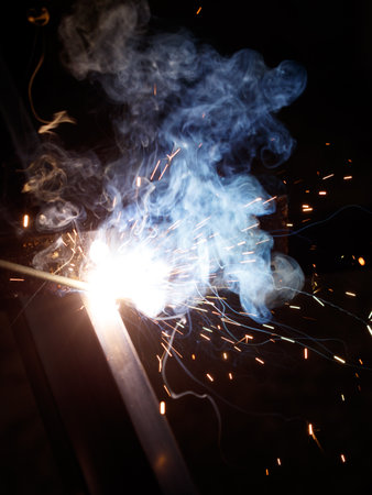 A piece of metal is being welded, and the sparks are flying. Concept of danger and excitement, as the sparks and smoke create a dramatic and intense atmosphere. The process of welding requires skill