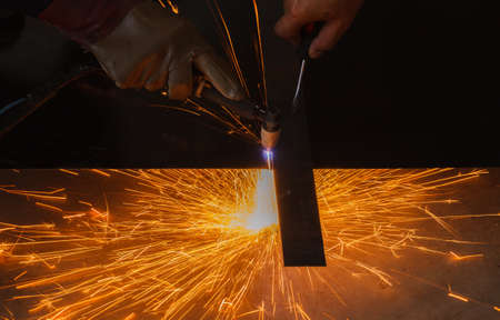 Closeup metal industry worker's hand welding steel sheet. Sparkler on black background. Heavy work in factory.
