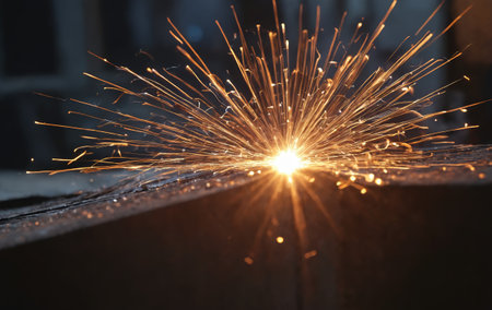 A dynamic close-up captures a craftsman welding metal in an industrial workshop, showcasing flying sparks and the skilled hands of a worker in protective gear.