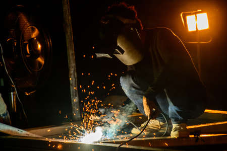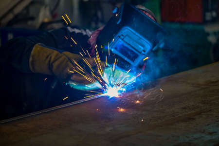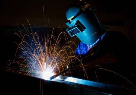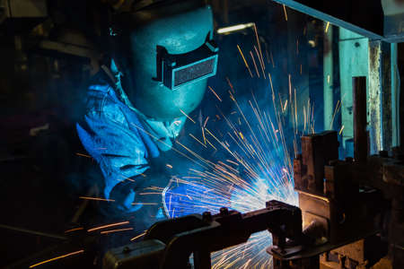 Welder uses welding machine to make sparks during manufacture of metal construction.