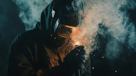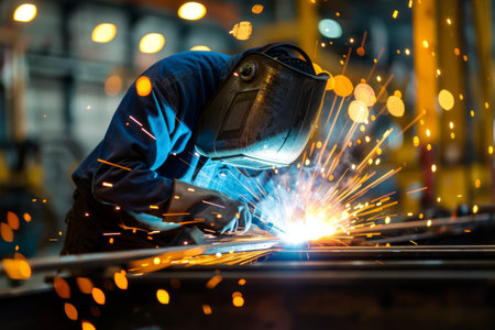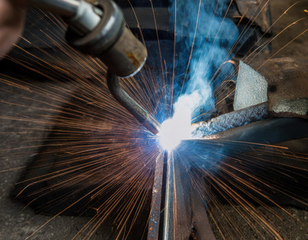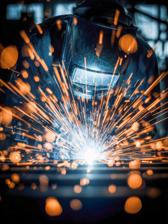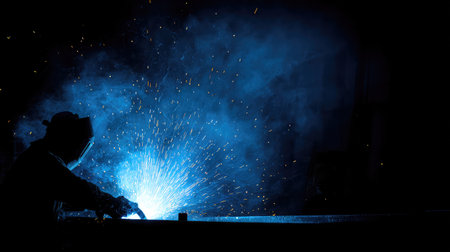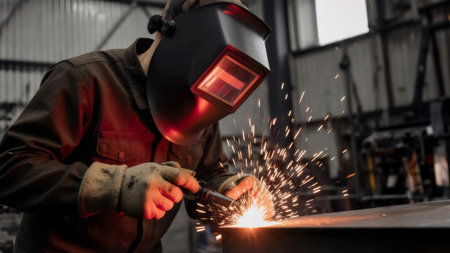 Welder at work, sparks flying as they operate an arc welder, highlighting the intensity and skill of the task