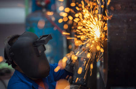 Industrial worker with protective mask welding metal at factory. Sparks while working