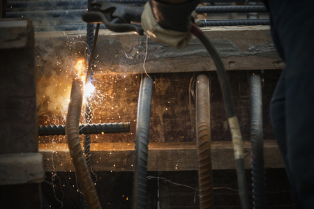 Close-up scene of the electric welding process. The welding operation at construction site.