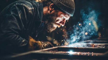 A skilled welder works diligently in a dimly lit workshop, creating sparks as metal fuses. The scene highlights the artistry of welding, showcasing equipment and safety measures.