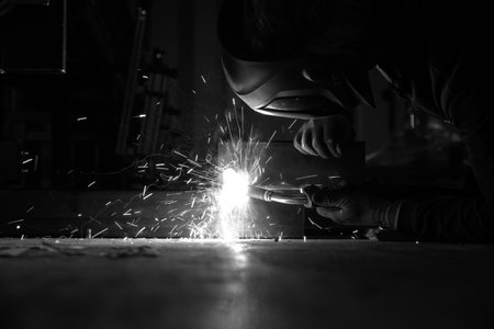 This image depicts the dynamic process of welding, showcasing bright sparks and a skilled worker focused on crafting metal in a dark workshop environment.