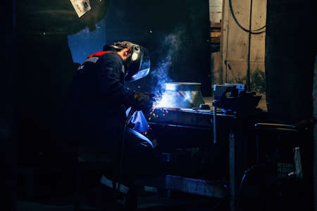 Welder is welding in the garage,industrial Worker labourer at the factory welding steel structure