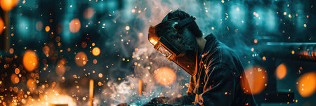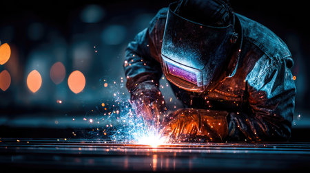 A proficient craftsman dons protective gear, skillfully fusing metal in a dimly lit workshop, where sparks and vibrant illumination define intense craftsmanship after hou