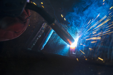 A person wearing a welding mask works on metal with a welding torch, creating sparks through the welding process