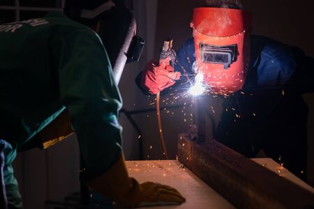 Metal welding steel works using electric arc welding machine to weld steel at factory. Metalwork manufacturing and construction maintenance service by manual skill labor concept.
