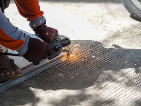 Man working on iron with grinder. Man at work. Sparkles and fire from grinder cutting. Grinder. Worker.