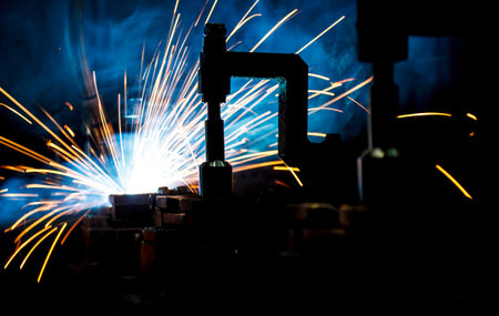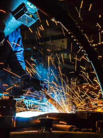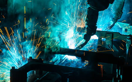 Detail of heavy industry manufacturing, sparks come out of a metal working welder.