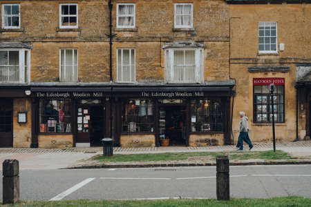 Broadway, UK - July 07, 2020: Exterior The Edinburgh Woolen Mill shop in Broadway, a large village and civil parish within the Cotswolds in the county of Worcestershire, England, couple walking past.