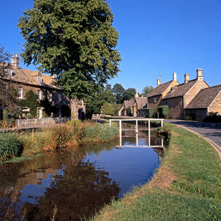 Lower Slaughter with river in Cotswold or Cotswolds district of southern England in the autumn.