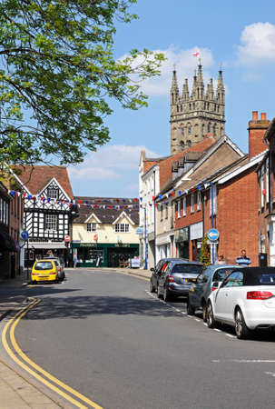Warwick, UK - May 18, 2014 - View along Brook Street with the St Marys Church tower to the rear, Warwick, Warwickshire, England, UK, Western Europe