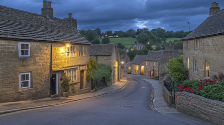 A tranquil cobblestone street meanders through a picturesque countryside village, with charming cottages glowing softly under the twilight sky.