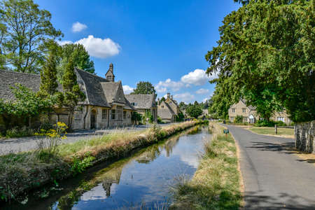 LOWER SLAUGHTER, THE COTSWOLDS, GLOUCESTERSHIRE, ENGLAND - JULY 14 th 2018: Cotswold stone cottages beside the River Eye in summer