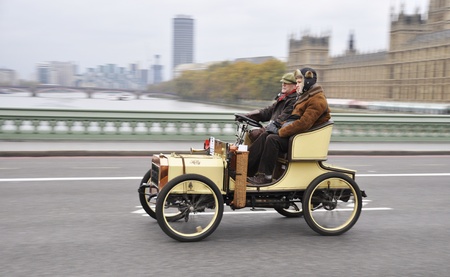 LONDON - NOVEMBER 06: London to Brighton Veteran Car Run participants crossing Westminster Bridge, on November 06, 2011 in London.
