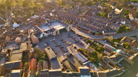 Aerial view of a town with a supermarket, parking lot, houses, and church. Warm lighting from the sun highlights the scene in Ripon, UK.