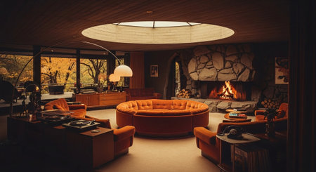 Interior of modern living room with orange sofas and fireplace