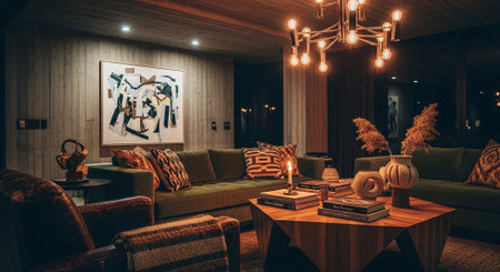 A cozy living room with modern decor, featuring a green sofa, artistic wall art, and stylish lighting