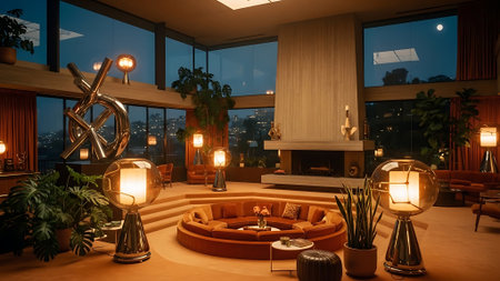 A cozy modern living room with large windows, featuring stylish furniture, warm lighting, and decorative elements like plants and books