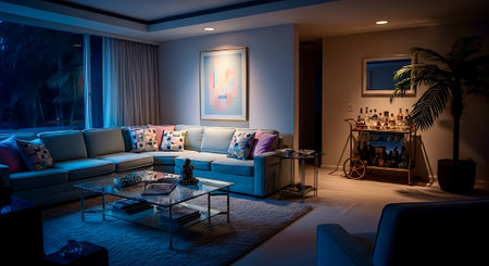 Comfortable modern living room scene at night.