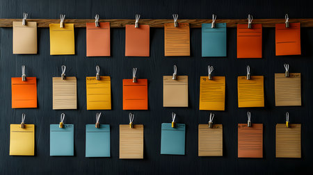 The image showcases colorful affirmation notes pinned on a dark panel using clips, presenting a bright atmosphere. The notes vary in colors and designs, enhancing creativity and positivity.