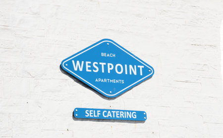 WEST BAY, UK - OCTOBER 10, 2022 - Westpoint beach apartments sign against a white wall, West Bay, Dorset, UK, Europe, October, 2022.